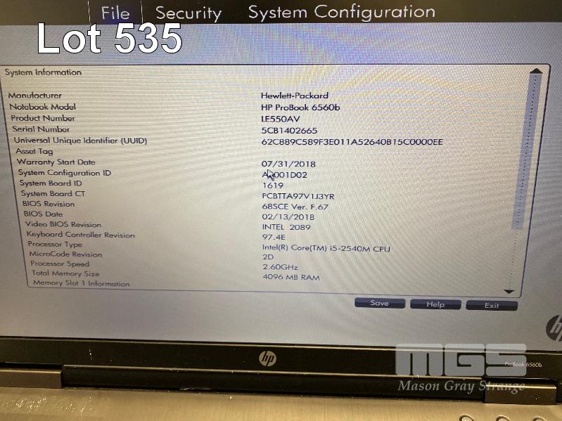 LAPTOP, HP PROBOOK 6560b (LE550AV), CORE i5 2540M (2ND GEN) @ 2.6GHz, 4GB DDR3 RAM, 250GB SATA HDD, DVD-RW, 15.6" WIDESCREEN (1366x768), INTEL HD VIDEO, Wi-Fi, BLUETOOTH, WINDOWS 7 PRO INSTALLED W/ LICENSE & POWER SUPPLY S/N:5CB1402665