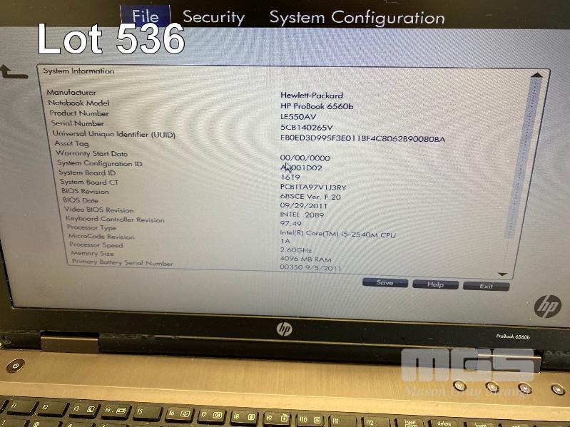 LAPTOP, HP PROBOOK 6560b (LE550AV), CORE i5 2540M (2ND GEN) @ 2.6GHz, 4GB DDR3 RAM, 250GB SATA HDD, DVD-RW, 15.6" WIDESCREEN (1366x768), INTEL HD VIDEO, Wi-Fi, BLUETOOTH, WINDOWS 7 PRO INSTALLED W/ LICENSE & POWER SUPPLY S/N:5CB140265V