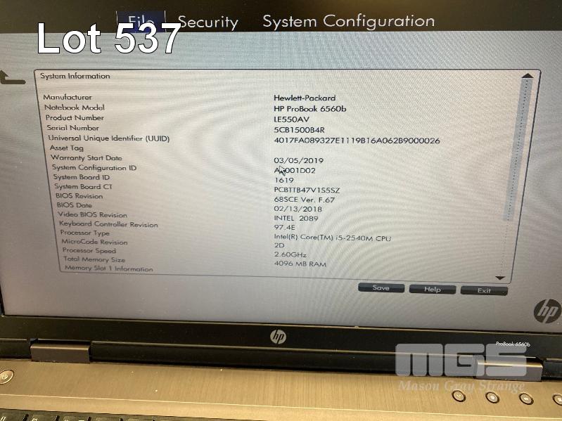 LAPTOP, HP PROBOOK 6560b (LE550AV), CORE i5 2540M (2ND GEN) @ 2.6GHz, 4GB DDR3 RAM, 250GB SATA HDD, DVD-RW, 15.6" WIDESCREEN (1366x768), INTEL HD VIDEO, Wi-Fi, BLUETOOTH, WINDOWS 7 PRO INSTALLED W/ LICENSE & POWER SUPPLY S/N:5CB1500B4R