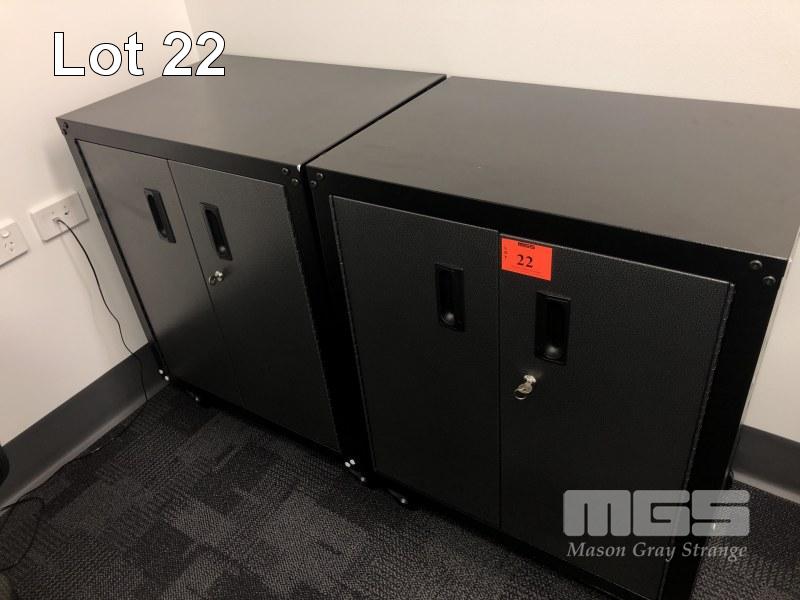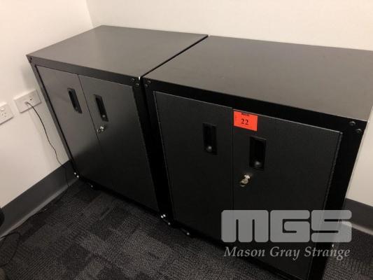 2 x STEEL LOWLINE STORAGE CABINETS, 2 DOOR, MOBILE