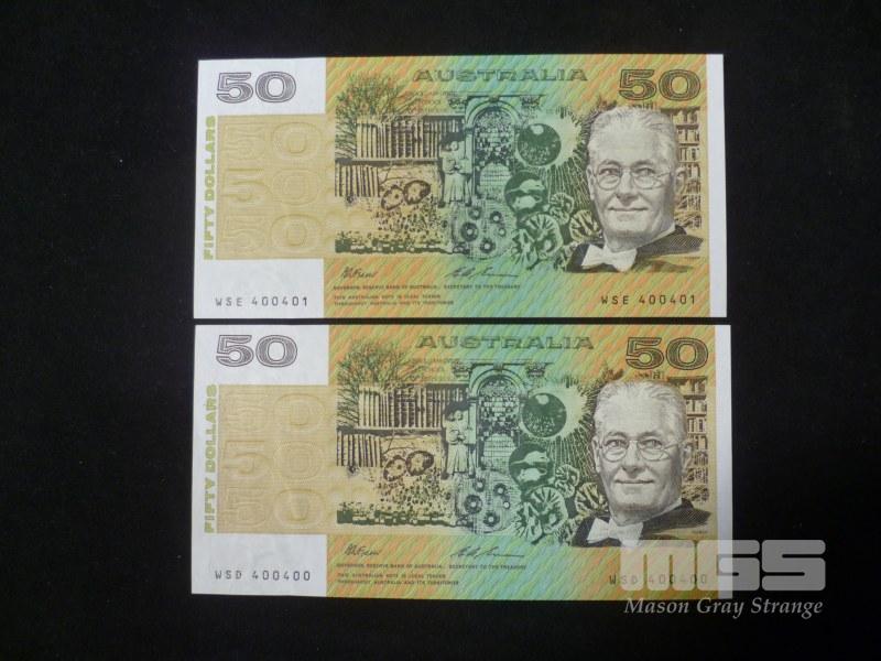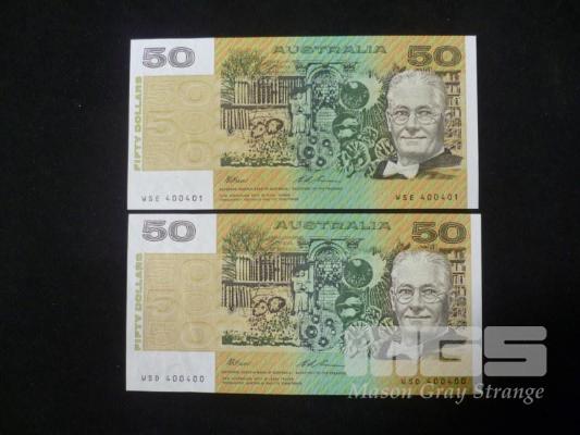 1993 2 x $50.00 NOTES CONSECUTIVE WITH REPEATER "400400" UNC