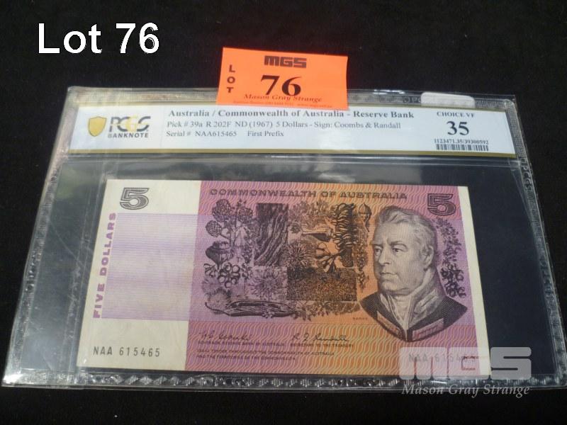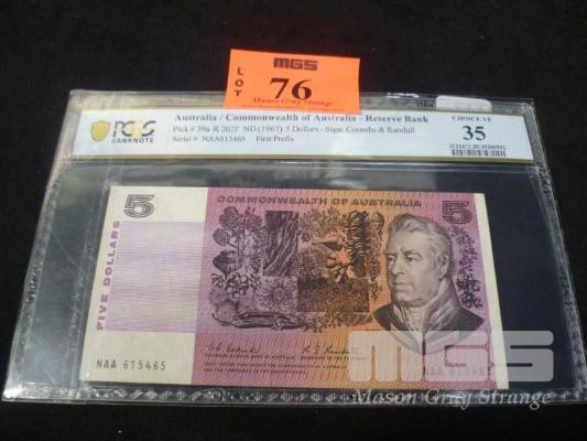 1967, COMMONWEALTH OF AUSTRALIA, $5 PAPER BANK NOTE, COOMBS/RANDALL, NAA 615465, (PCGS CHOICE VF 35)