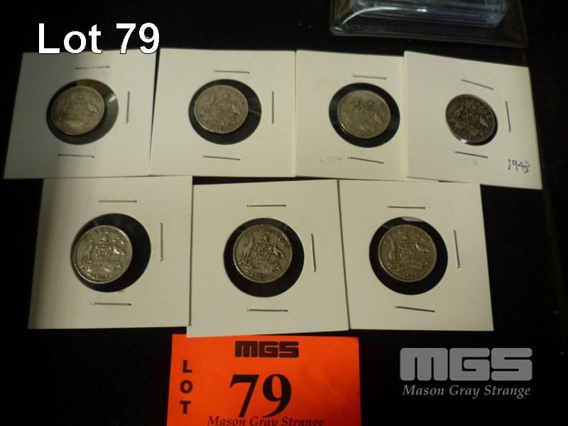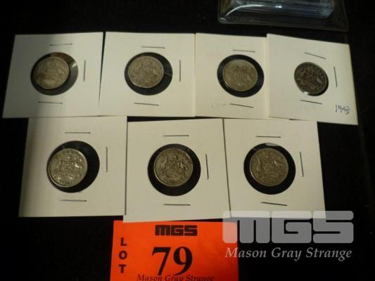 7 X AUSTRALIA SIXPENCE, WWII PERIOD, INC; 1939, 1940, 1941, 1942, 1943, 1944, 1945