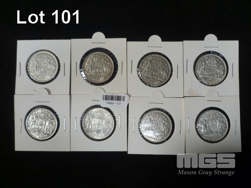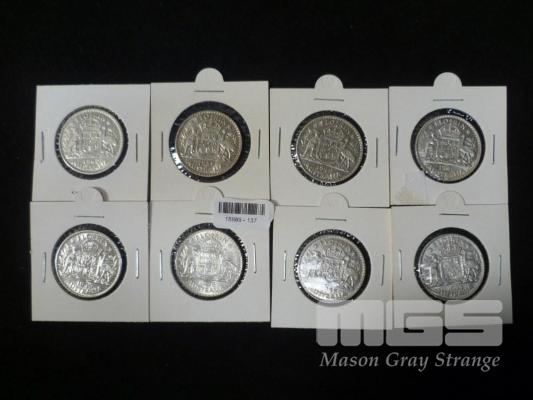 8 X AUSTRALIAN FLORINS, CONSECUTIVE YEARS 1939 TO 1946, VF GRADE