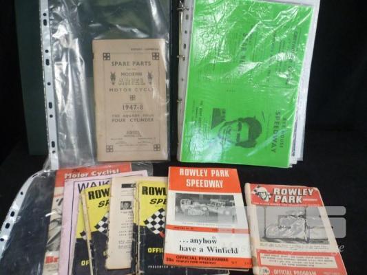 ASSORTED RACING EPHEMERA INCLUDING ROWLEY PARK SPEEDWAY OFFICIAL PROGRAMS 1950'S, 60'S & 70'S, PHOTOCOPIES OF RELEVANT ARTICLES, ARIAL MOTORCYCLE SPARE PARTS CATALOGUE ETC