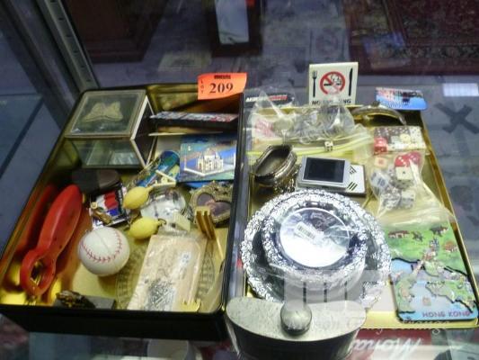 TRAY OF ASSORTED CURIOS, INC; DICE, WORLD COINS, SMALL SILVER BOWL, HALLMARKED, KEY RINGS, ETC
