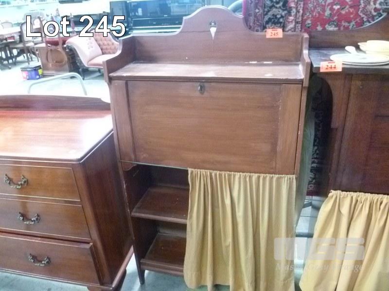 OAK FALL FRONT WRITING DESK WITH 2 TIER UNDERSTORAGE, CURTAIN FRONTED