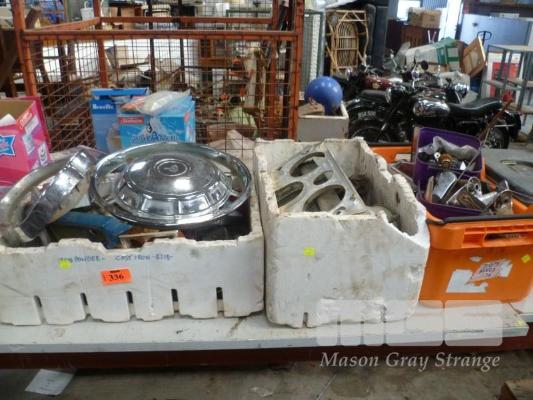 ASSORTED AUTOMOTIVE COMPONENTS, HUB CAPS, TAIL LIGHT TRIMS, CLUSTER SURROUNDS, GRILLS, WINDOW WINDING HANDLES, SIDE MIRRORS ETC