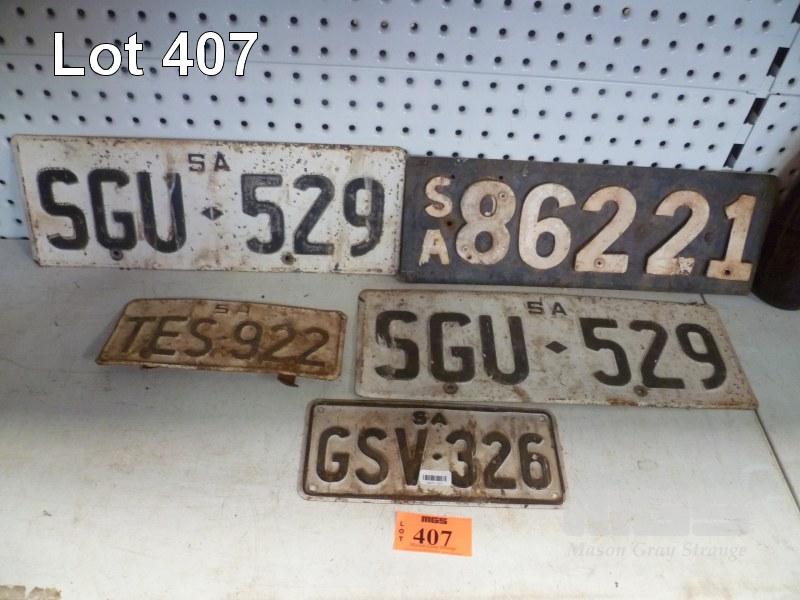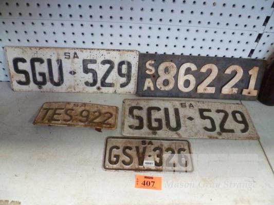 5 x VINTAGE REGISTRATION PLATES, "TO BE USED IN THE MAN CAVE"