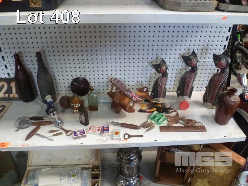 CAT FIGURES, WOODEN PLANE, VINTAGE BOTTLES, BOTTLE OPENERS, UN-USED MATCHES, VINTAGE DARTS, ETC