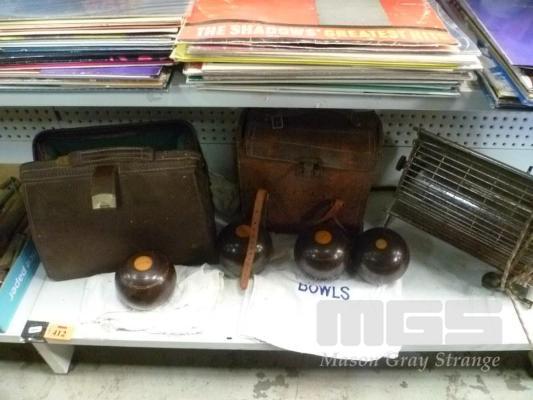 VINTAGE BOWLS IN OLD SCHOOL LEATHER BAG, GLADSTONE BAG & HECLA HEATER