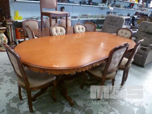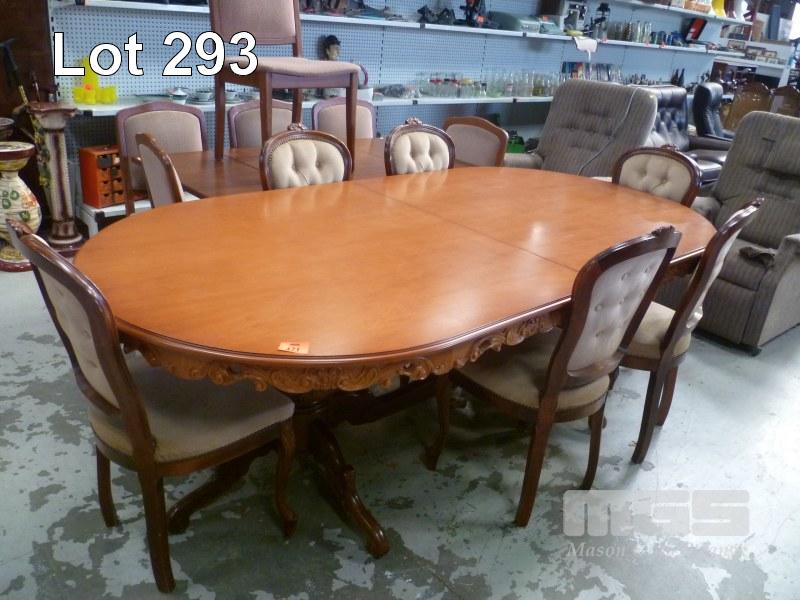 DINING SUITE, 7 PIECE COMPRISING OF MAGNIFICENT OVAL EXTENSION DINING TABLE & 6 X DECORATIVE CARVED GOLD FABRIC UPHOLSTERED DEEP BUTTON DINING CHAIRS