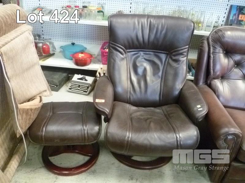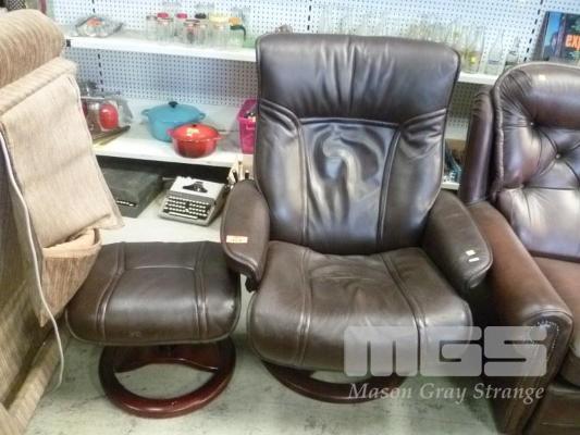 MORAN FURNITURE BROWN LEATHER UPHOLSTERED SWIVEL RECLINGIN ARM CHAIR & MATCHING FOOT STOOL