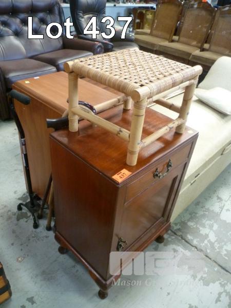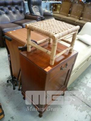 TIMBER 3 DRAWER CHEST, MAHOGANY SINGLE DOOR/DRAWER CABINET, CANE SIDE TABLES & 4 x ASSORTED WALKING STICKS