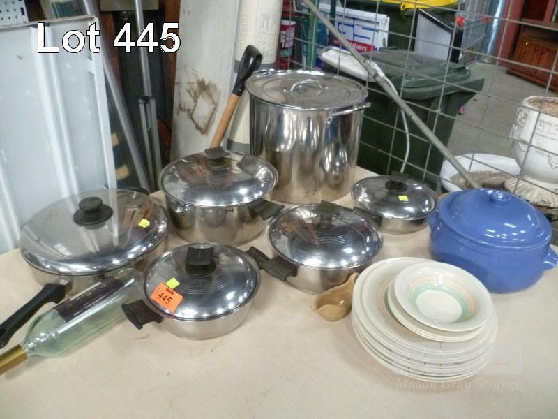 ASSORTED COOKWARE, POTS, PANS, PART DINNER SERVICE ETC
