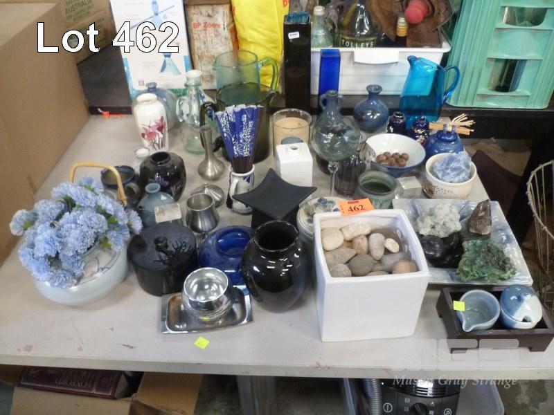 ASSORTED COLOURED GLASSWARE & POTTERY, VASES, BOWLS, ETC