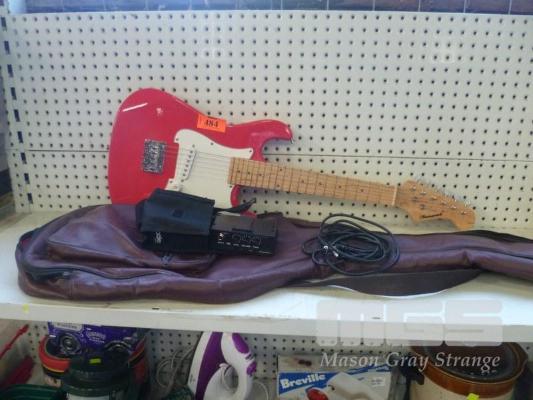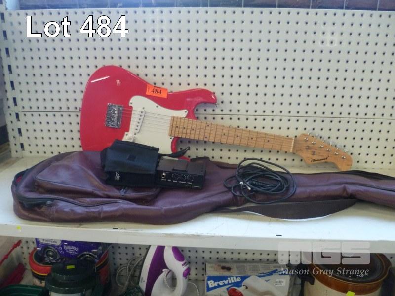 BURSWOOD RED ELECTRIC GUITAR, CHILDRENS SIZE & CARRY BAG