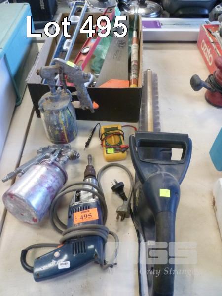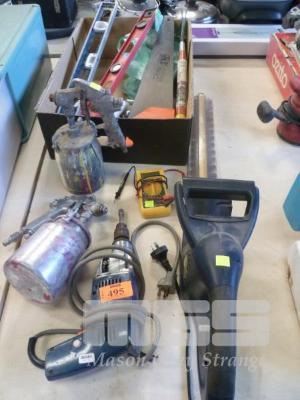 GMC HEDGE GRIMMER, 240V, AEG HAMMER DRILL, 2 x SPRAY PAINT GUNS, MULTI METER, 2 x SPIRIT LEVELS, SAW, ETC