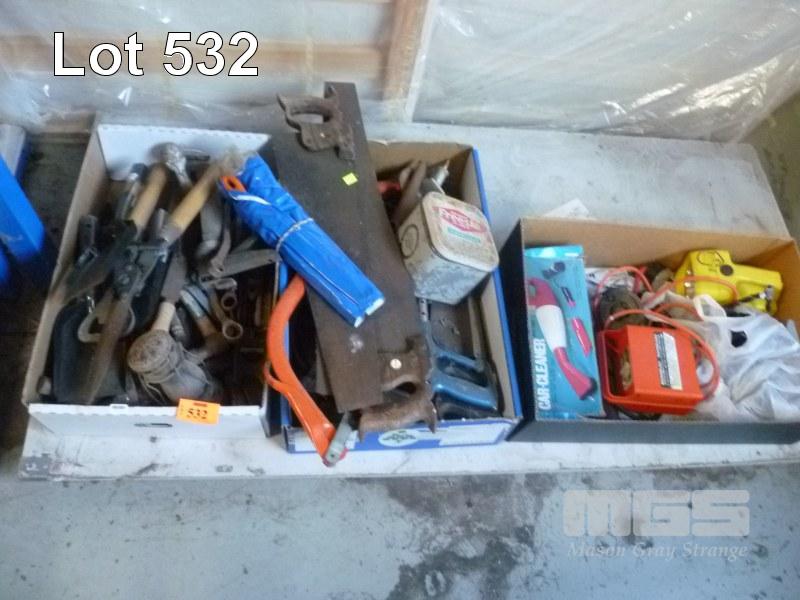 ASSORTED HAND TOOLS INC SAW, SPANNERS, PLIERS, SPIRIT LEVEL, ETC, 3 x BOXES