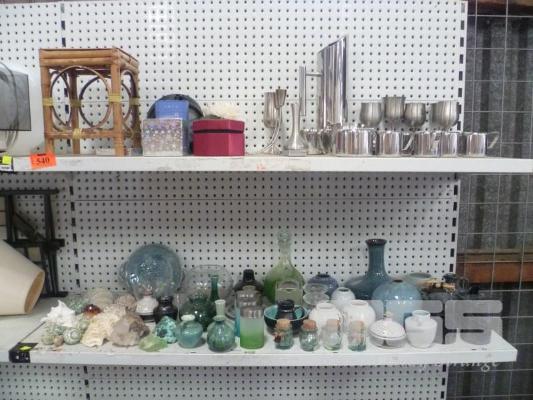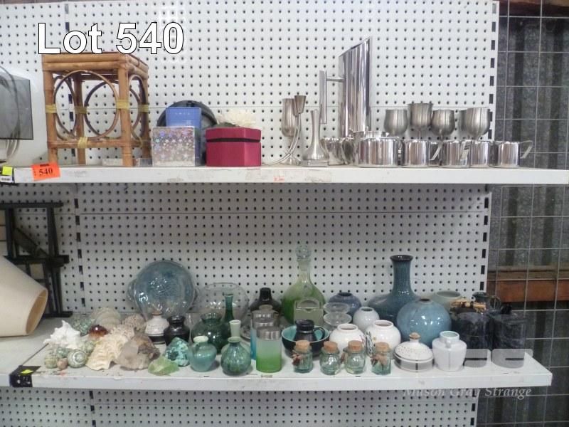 CERAMIC & GLAZED VASES, STAINLESS STEEL & PEWTER CUPS & VASES, SEA SHELLS, ETC, 2 x SHELVES