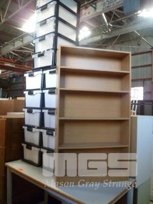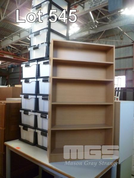 3 x PLASTIC 5 DRAWER STORAGE UNITS, 1 x TIMBER LAMINATE SHELF UNIT, 5 TIER, 1100 x 620mm & STEEL FRAME, TIMBER LAMINATE TOP WHITE TABLE, 1200 x 600mm