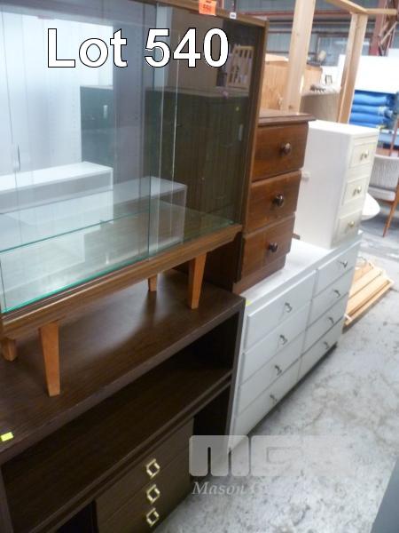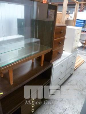 2 x BEDSIDE CABINETS, 3 DRAWER CHEST IN CABINET, WITH 8 DRAWER WHITE TIMBER UNIT & SLIDING GLASS DOOR DISPLAY STAND/CABINET, 830 x 830mm