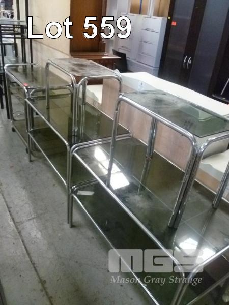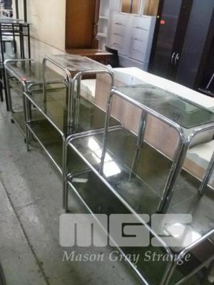 SET 4 RECTANGULAR COFFEE TABLES, 2 x SIDE TABLES & DRINKS TROLLEY, ALL CHROME FRAMED, SMOKEY GLASS