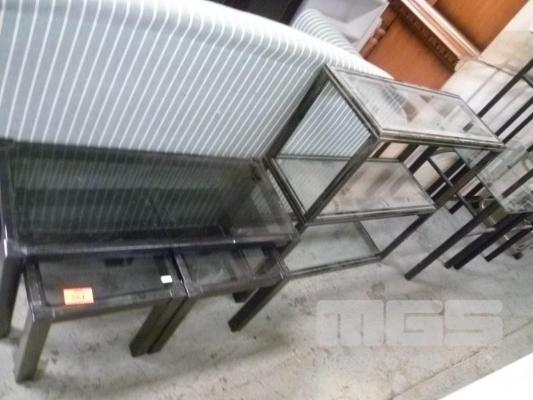 BLACK METAL FRAME SHELF UNIT WITH BLACK TIMBER FRAME COFFEE TABLE WITH MATCHING, SIDE TABLES