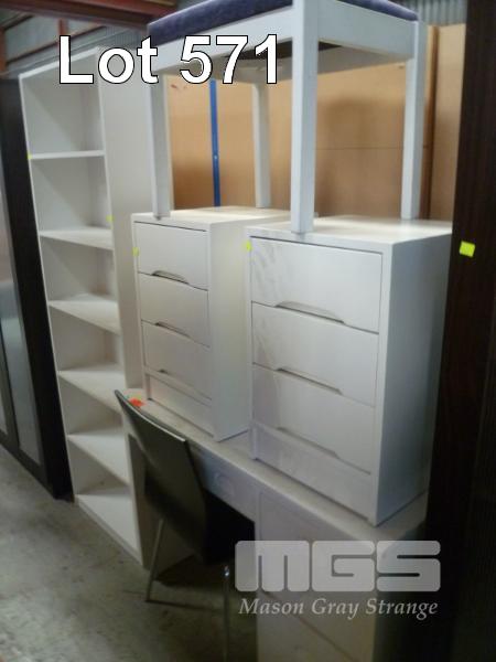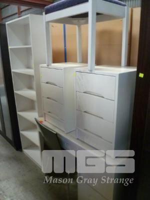 WHITE PAINTED TIMBER STUDENTS DESK, PAIR BEDSIDE CABINETS, STOOL, BENTWOOD OFFICE CHAIR & WHITE LAMINATE BOOKCASE