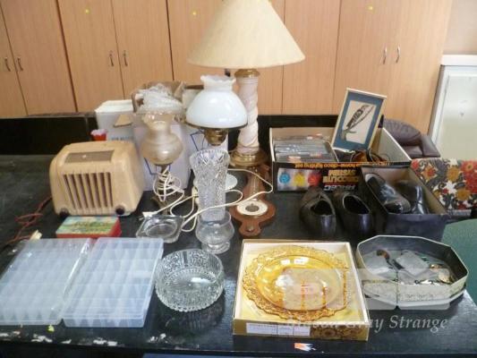 MENS LEATHER SHOES, SIZE 9, SOCKS,T ABLE LAMPS, COACH LIGHTS, ETC, 1 x TABLE