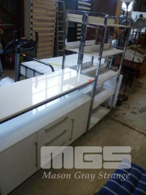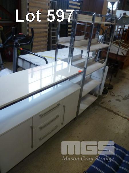 WHITE GLOSS SIDEBOARD, CHROME FRAME, 2 DOOR, 3 DRAWER & PAIR MATCHING SHELF UNITS, 5 TIER