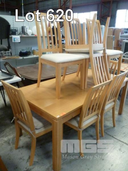 DINING TABLE, SOLID TIMBER, 1800 x 900mm, CHECKER PIECE LOOK TOP & 8 x MATCHING PINE FRAME, CREAM CLOTH UPHOLSTERED