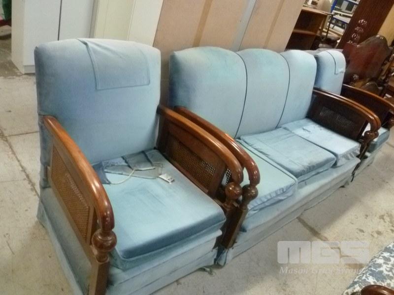 TIMBER FRAMED, CANE SIDED LOUNGE SUITE, BLUE FABRIC UPHOLSTERED