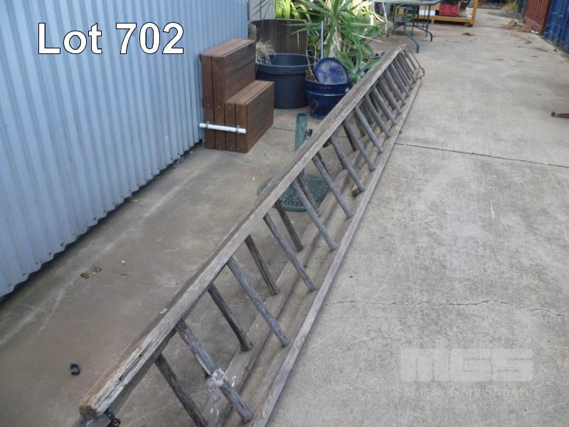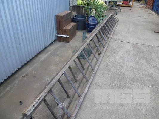 3 X VINTAGE TIMBER LADDERS, LENGTHS; 4.9METRES, 5.5 METRES, 3.7METRES