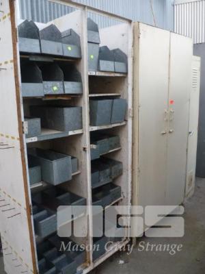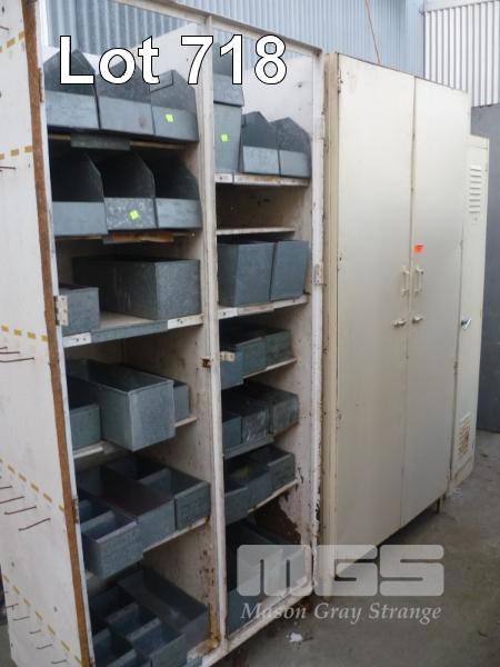 METAL SINGLE DOOR LOCKER, METAL 2 DOOR STORAGE CABINET, METAL CABINET (NO DOORS) WITH SOME ASSORTED PARTS TRAYS