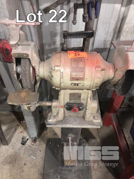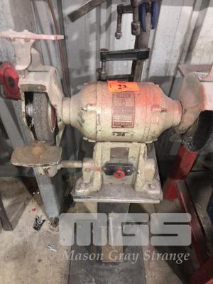 DOUBLE ENDED GMF GRINDER, 8" WITH WIRE BUFF, 240V ON PEDESTAL.