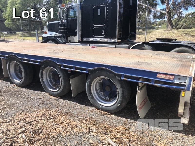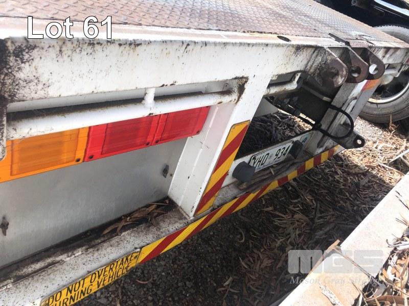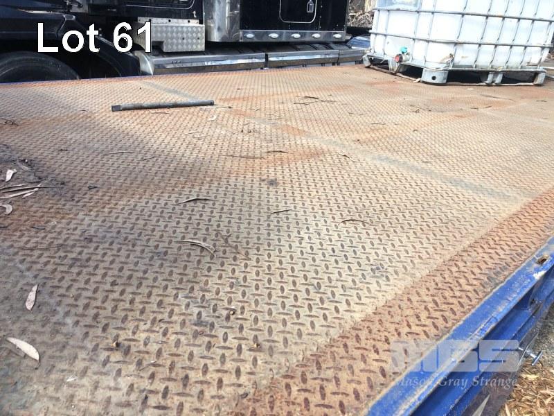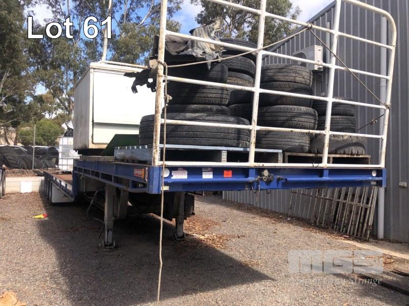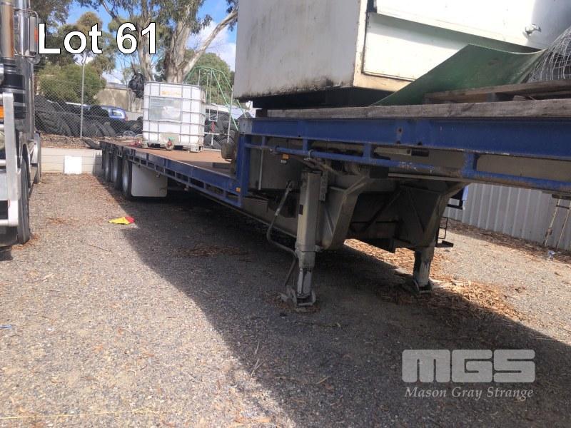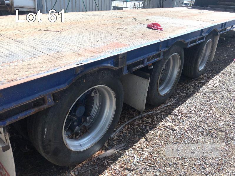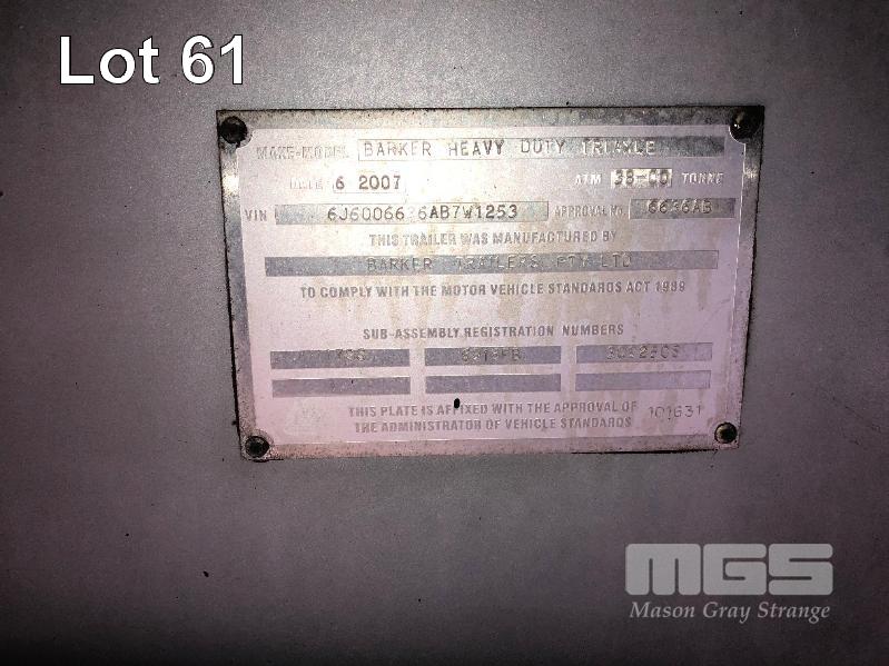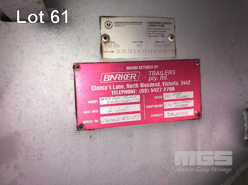 06 / 2007 BARKER TRIAXLE DROP DECK SEMI TRAILER REG: YHD 934 (SA) VIN / CHASSIS: 6J6006636ABTW1253 ATM: 38,000kg AIRBAG SUSPENSION, DUAL SPIDER RIM, MOD: HEAVY DUTY ROAD TRAIN 1 x SPARE TYRE 13.7m, 45' LONG CHECKER PLATE STEEL DECK AVERAGE TYRES WABCO RISE & FALL ADJUSTER 2 x UNDERDECK TOOL BOXES WATER TANK
