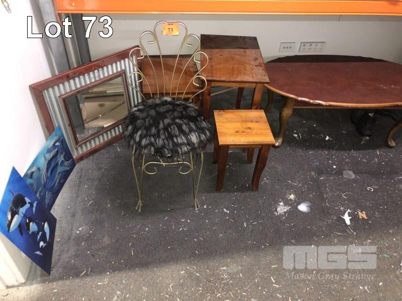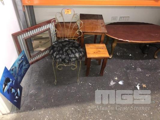 ASSORTED FURNITURE & FRAMES, NEST 3 TABLES, DECORATIVE OVAL, TIMBER LAMINATE COFFEE TABLE, 110 x 60cm & DECORATIVE WIRE FEATHER STOOL