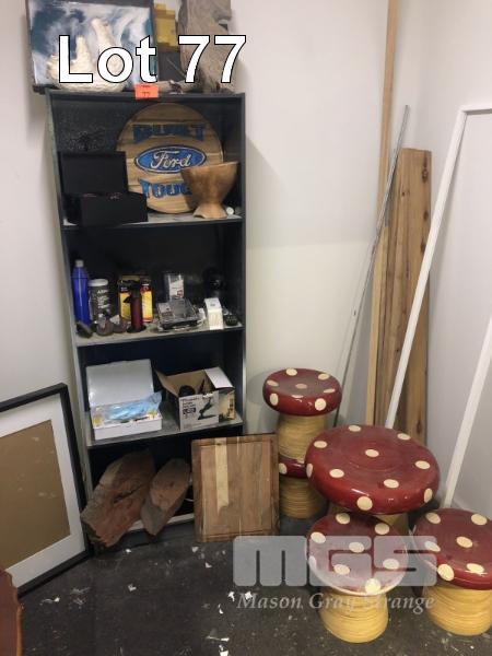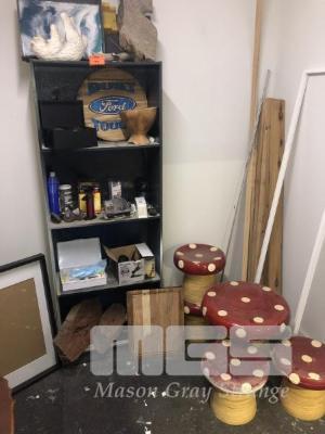 SHELF UNIT & CONTENTS INC BUNDABERG DECORATIVE GLASSES, TIMBER CRAFT WORK, GOBLETS, PLATTERS, MUSHROOM STOOLS, ETC