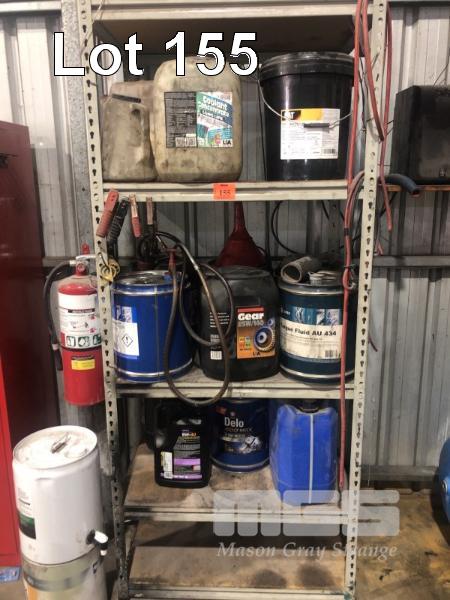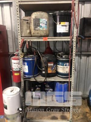 ASSORTED OILS INC TRANS, ENGINE, DIFF, HYDRAULIC, SOLVENTS, 2 x HAND PUMPS, RACK, 2000 x 1000mm APPROX & CONTENTS, PUMP & JERRY CANS