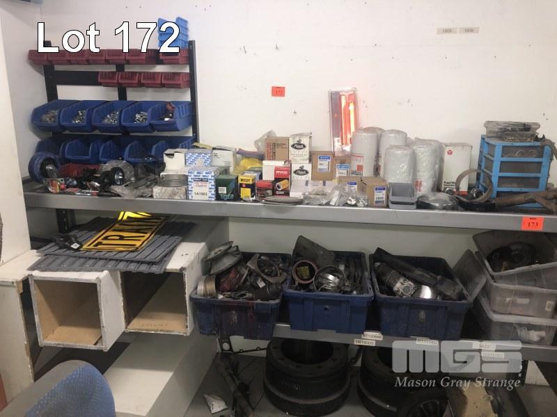 FLEETGUARD OIL FILTERS, MAX FUEL FILTERS, RYCO FILTERS, DONALSON FILTERS, VARIOUS CASTOR WHEELS, HARDWARE, NUTS, BOLTS PINS, USED TRUCK PARTS, CONTENTS OF RACK & HOSE CLAMPS ON WALL