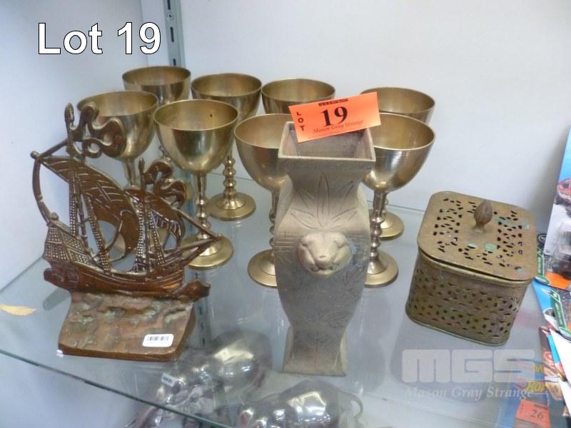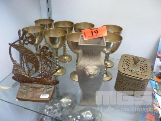 ASSORTED BRASSWARE INC SET 8 GOBLETS, NAUTICAL DOOR STOP, VASE & POTPOURRI HOLDER