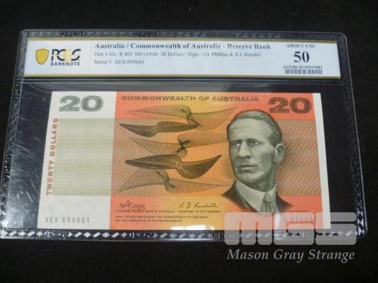1968, COMMONWEALTH OF AUSTRALIA, $20 PAPER BANK NOTE, PHILLIPS/RANDALL, XES 694661, (PCGS ABOUT UNC 50)