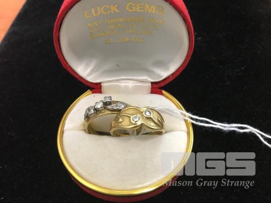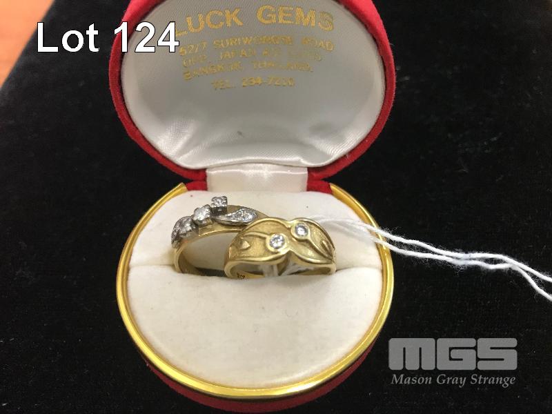 2 X GOLD RINGS MARKED 18CT, 1 X SET WITH 2 X SMALL DIAMONDS SIZE 8, 1 X 3 SMALL DIAMONDS SIZE 10 (US) 9.8 GRAMS TOTAL