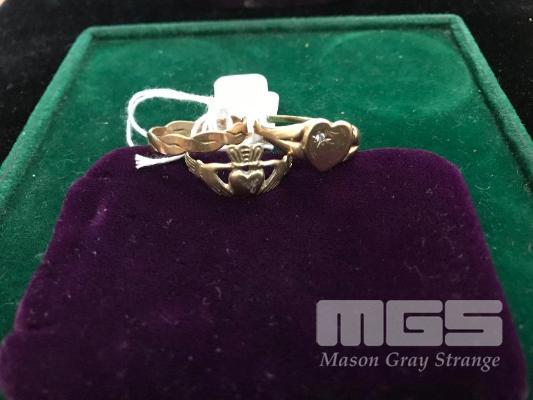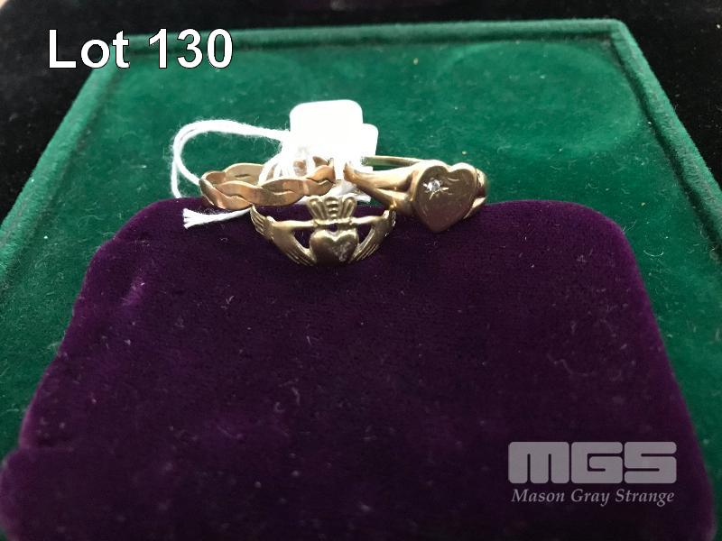3 X GOLD RINGS MARKED 9CT, 2 X HEART SHAPED CYGNET RINGS 1 X WITH SMALL CLEAR STONE SIZE 10.5 & 8, 1 X PLAIN SIZE 8, 5.8 GRAMS TOTAL