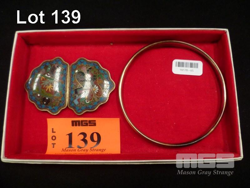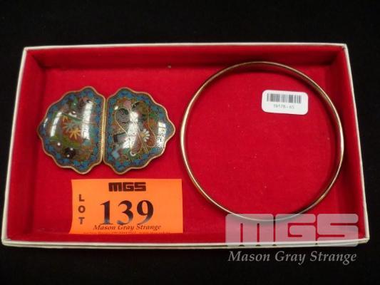 CLOISONNE BUCKLE & GOLD BANGLE MARKED 9ct, SILV LINED