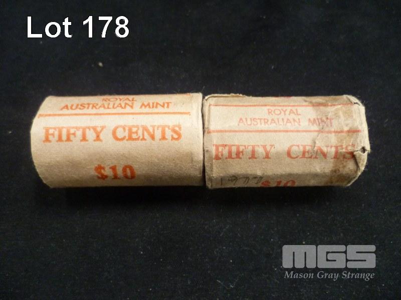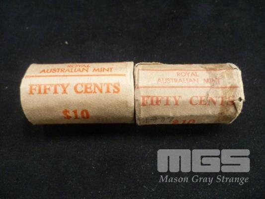 2 X ROYAL AUSTRALIAN MINT, UNCIRCULATED, COMMEMORATIVE, 50c BANK ROLLS, INC; 1977, 1982
