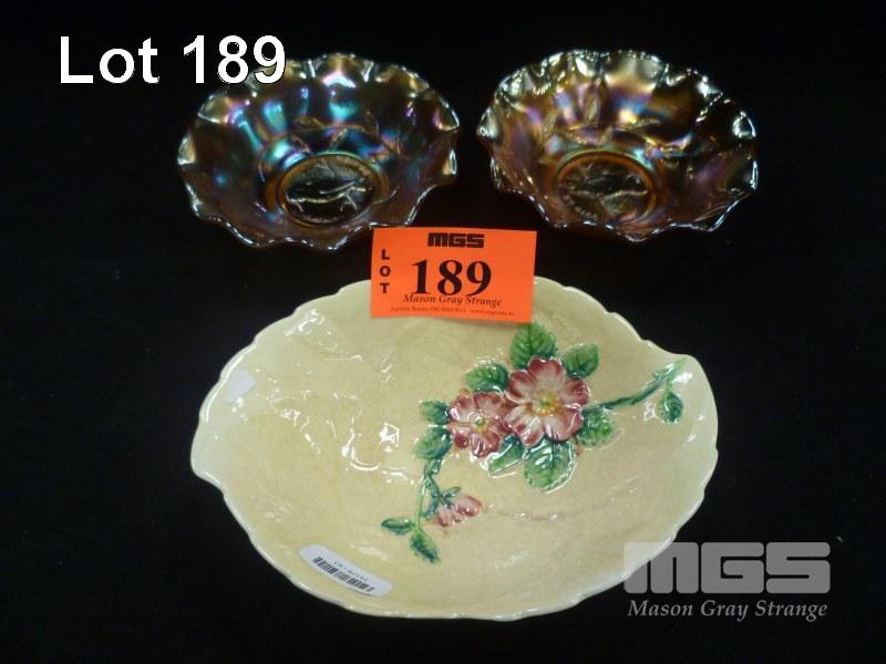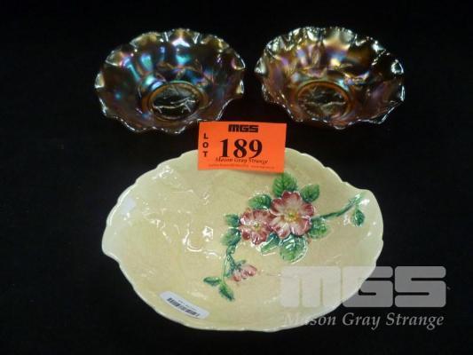 PAIR MARIGOLD CARNIVAL GLASS BOWLS, DEPICTING KOOKABURRA & CARLTONWARE BOWL