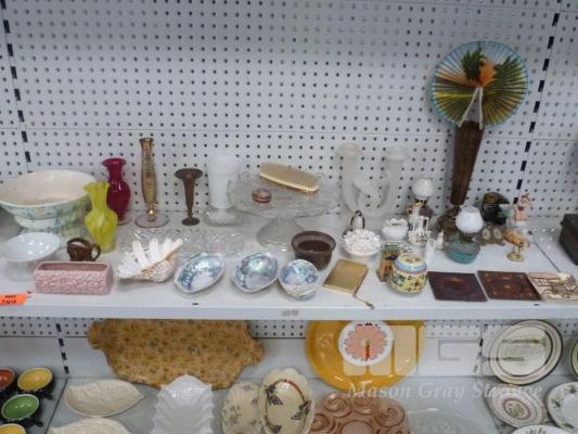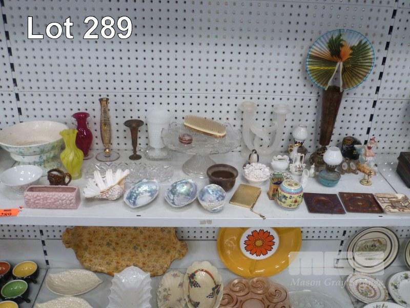 SMALL FIGURINES, SEA SHELLS, GLASS VASES, ETC