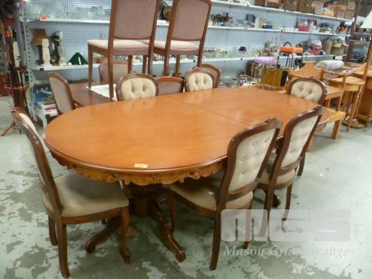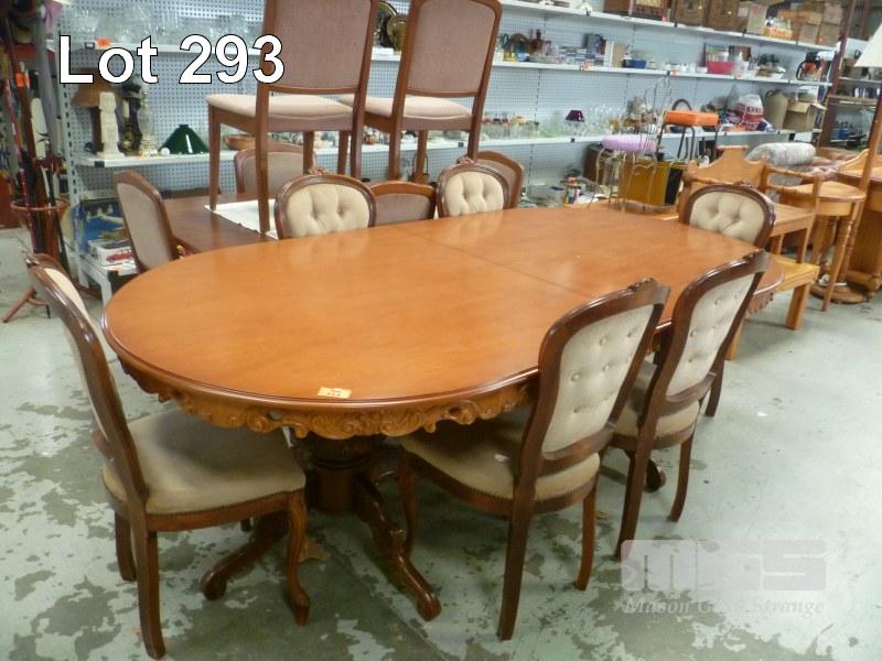 DINING SUITE, 7 PIECE COMPRISING OF MAGNIFICENT OVAL EXTENSION DINING TABLE & 6 X DECORATIVE CARVED GOLD FABRIC UPHOLSTERED DEEP BUTTON DINING CHAIRS